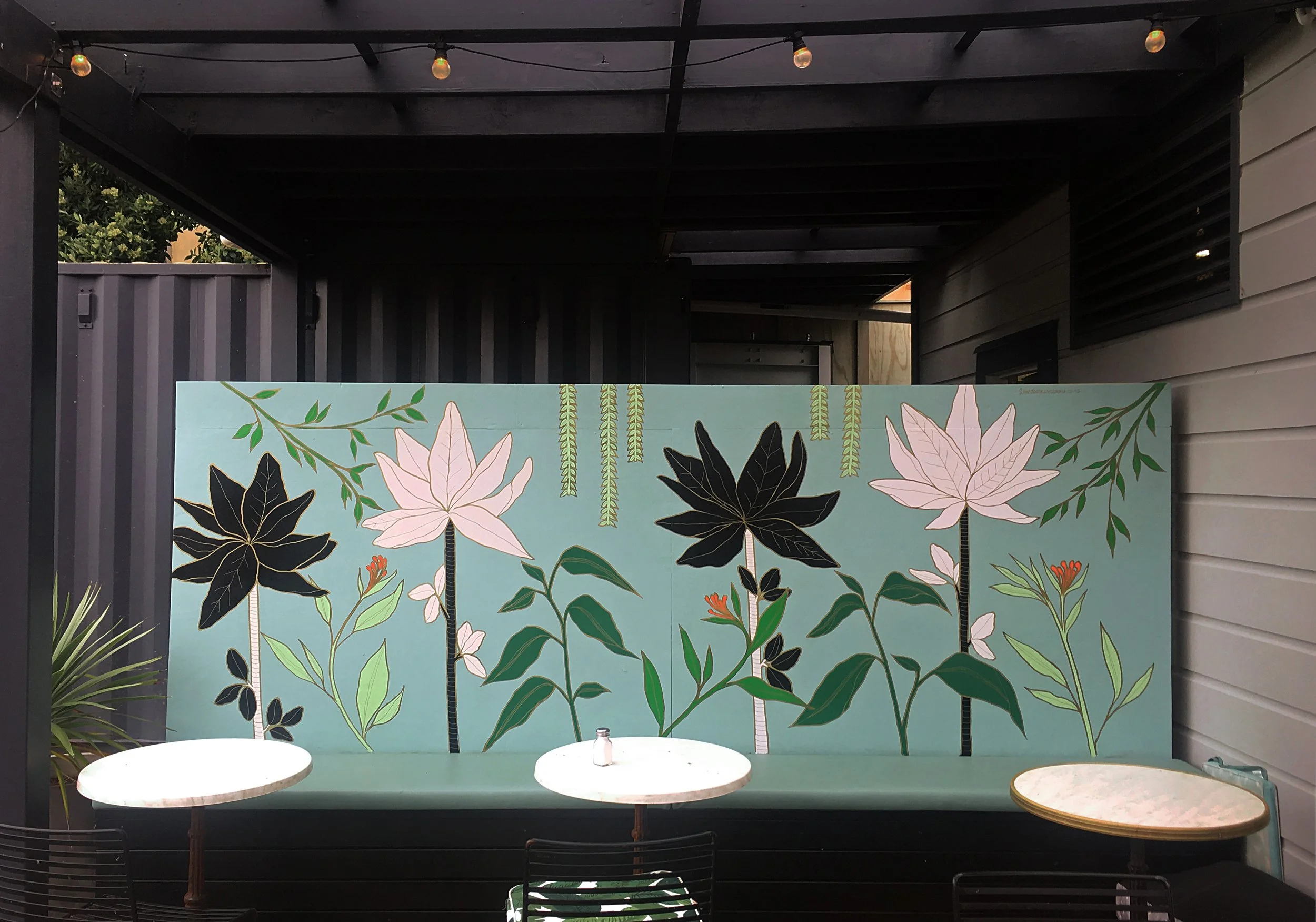 I painted this Japanese-inspired wall of plants for vegetarian cafe and restaurant, The Botanist, in Lyall Bay, Wellington.